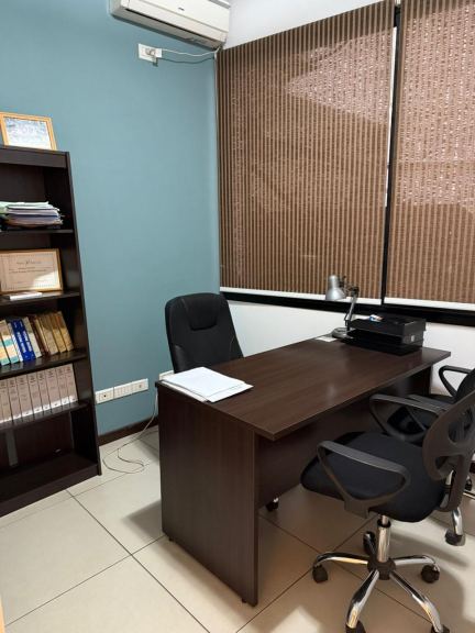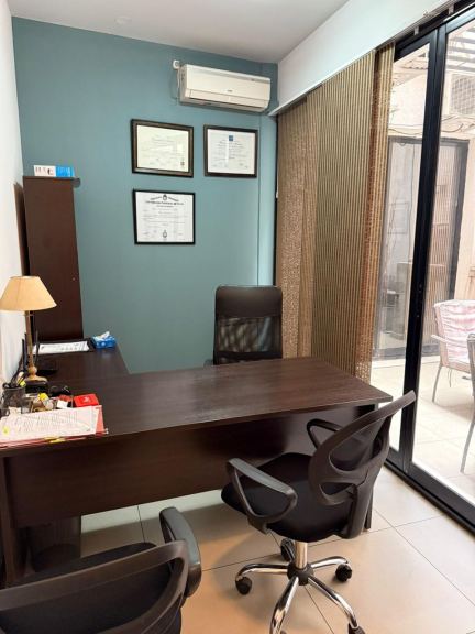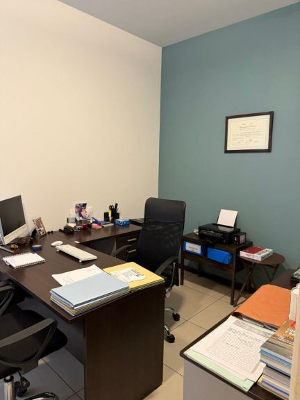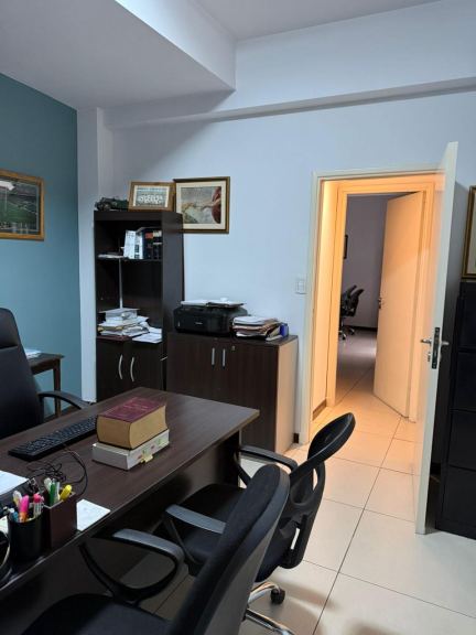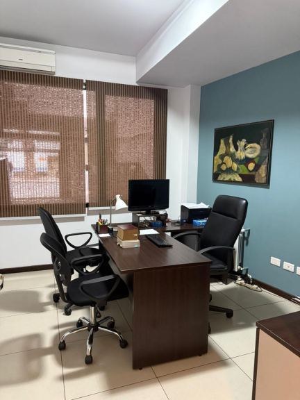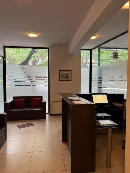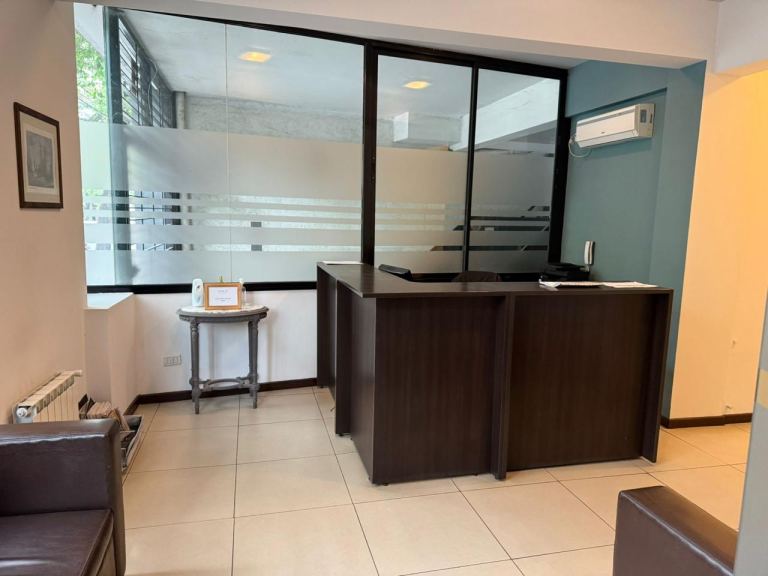Amplia recepción, cuatro privados, sala de reuniones, sala de trabajo amplia, patio interno, kitchenette dos baños uno completo y un toilette. La oficina cuenta con calefacción central y aires acondicionados, cortinas. La oficina posee doble cochera en el mismo edificio